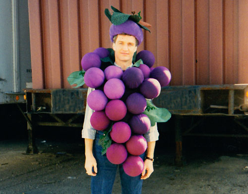 This costume was worn at a trade show promoting computer clustering, thus the grape idea. It was our very first food costume; each grape is an individually-dyed foam rubber ball. -
