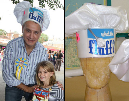 Another in a series of entertaining costume prizes we have made to be awarded at the now-annual Fluff Festival in Somerville's Union Square, these chef's hats feature the Fluff logo, but with a silly 70s twist. Astronaut Rick Linnehan, shown here, carried Fluff on the space shuttle!